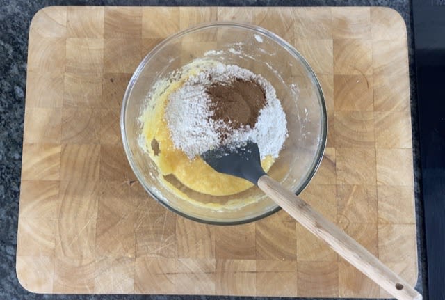 4. Once mixed together, add the yolks, flour, all spice, and nutmeg and beat well together until a smooth creamy mixture